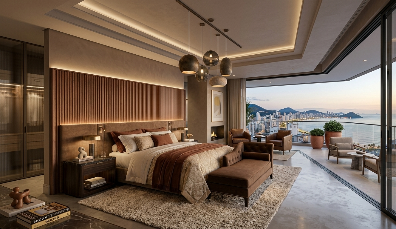 A suíte master é, por definição, o ambiente mais privado de uma residência. É o lugar do recolhimento, do ritual pessoal e da expressão mais autêntica do gosto do morador. Justamente por isso, nenhum convidado precisa aprovar esse espaço — e ele tende a ser o mais honesto de toda a casa.