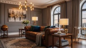 Tons neutros como bege, cinza e branco valorizam o sofá em couro marrom clássico. Dessa forma, criam base sofisticada para adicionar acentos coloridos. Por isso, mantêm elegância sem competir com o protagonismo do couro.